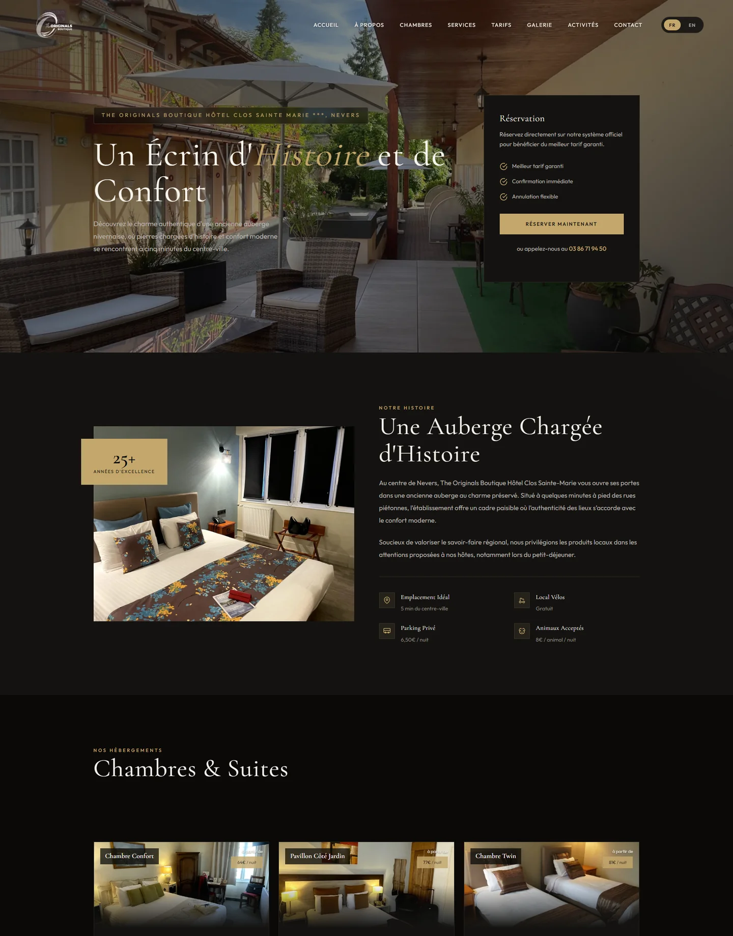 Site vieillissant qui ne reflétait pas la qualité du lieu. Aucune réservation en ligne, dépendance totale aux OTA (Booking, Airbnb).